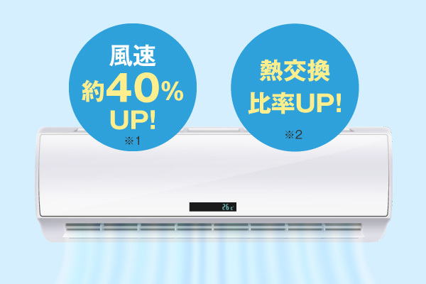 フィルター掃除だけでは除去できない、ニオイのもとにもなるエアコン内部のカビ、ホコリ、汚れをしっかり落としきることで、 カビや⽬に⾒える汚れはもちろん、サービス実施後は風速が約40%※1アップ!冷暖房時の熱交換比率もアップ※2する検証事例もあります。