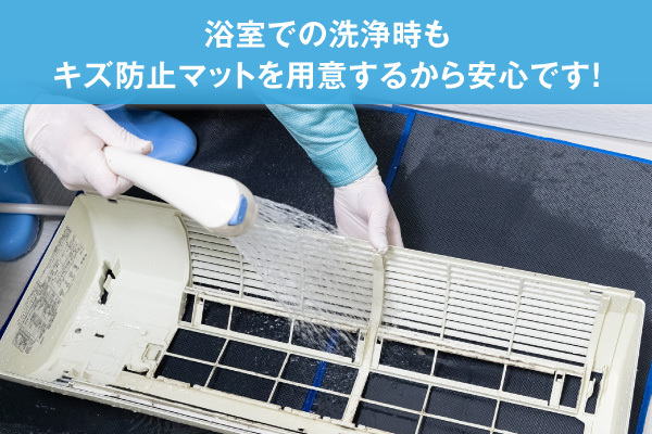 浴室内でパーツの洗浄を行う際も、キズ防止マットを持ち込んで作業します。