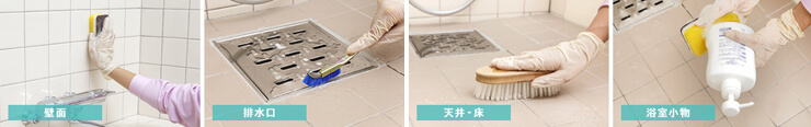 スピーディーかつ確実に洗浄するため、汚れの種類や状態をしっかり確認。浴槽や壁・床など、それぞれの材質に合わせて最適な薬剤と道具を使用します。