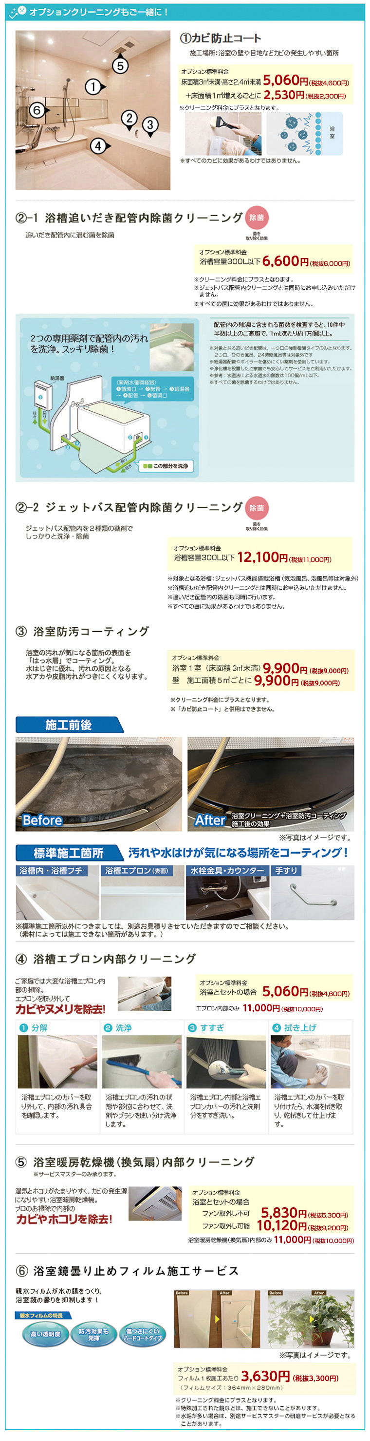 「カビ防止コート」、「浴槽追いだき配管内除菌クリーニング・ジェットバス配管内除菌クリーニング」、「浴室防汚コーティング」、「浴槽エプロン内部クリーニング」、「浴室暖房乾燥機(換気扇)内部クリーニング」、「浴室鏡曇り止めフィルム施工サービス」の6つのオプションを組み合わせることで、浴室内をさらに清潔に保てます。