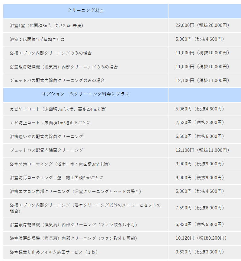 「カビ防止コート」、「浴槽追いだき配管内除菌クリーニング・ジェットバス配管内除菌クリーニング」、「浴室防汚コーティング」、「浴槽エプロン内部クリーニング」、「浴室暖房乾燥機(換気扇)内部クリーニング」、「浴室鏡曇り止めフィルム施工サービス」の6つのオプションを組み合わせることで、浴室内をさらに清潔に保てます。