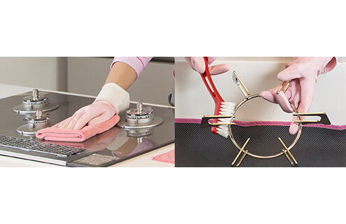 水や油を頻繁に使うキッチンは汚れ方もガンコ。こすってもなかなか落とし切れない油汚れやこげつき、見落としがちな細かい場所も残さず洗浄します。