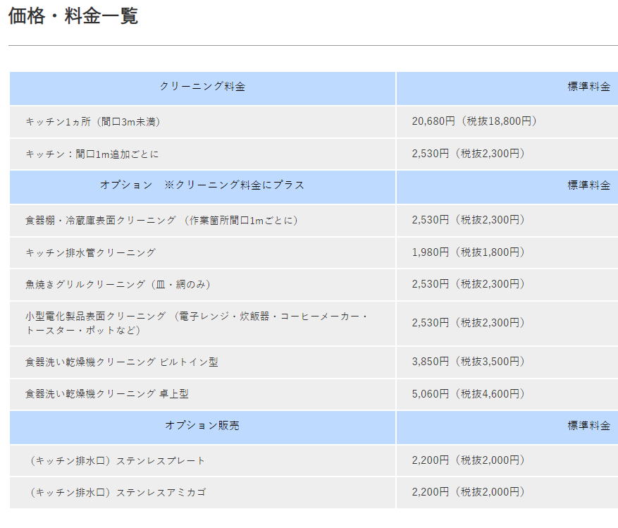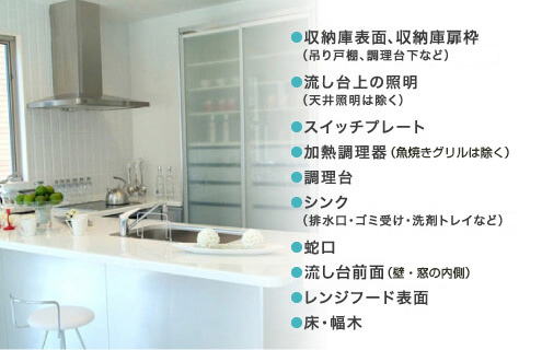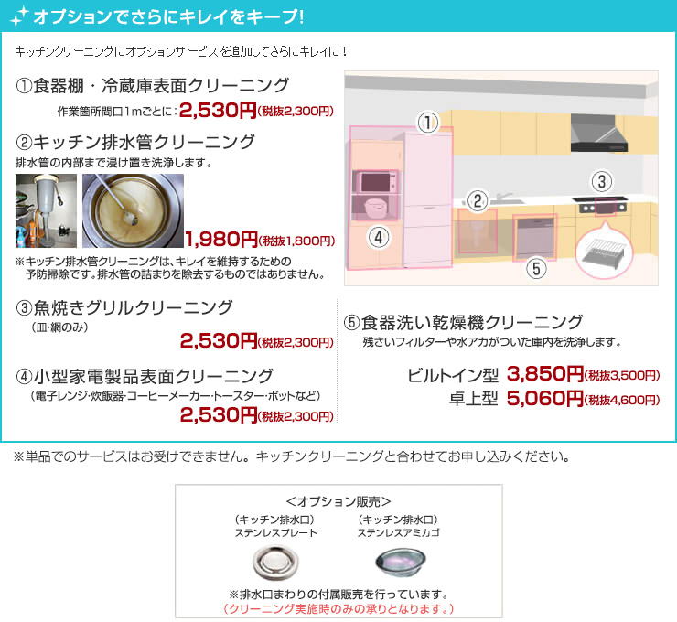 「食器棚・冷蔵庫表面クリーニング」「キッチン排水管クリーニング」「魚焼きグリルクリーニング」「小型電化製品表面クリーニング」「食器洗い乾燥機クリーニング」の5つのオプションクリーニングを追加してさらにキレイに!