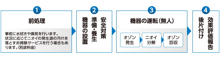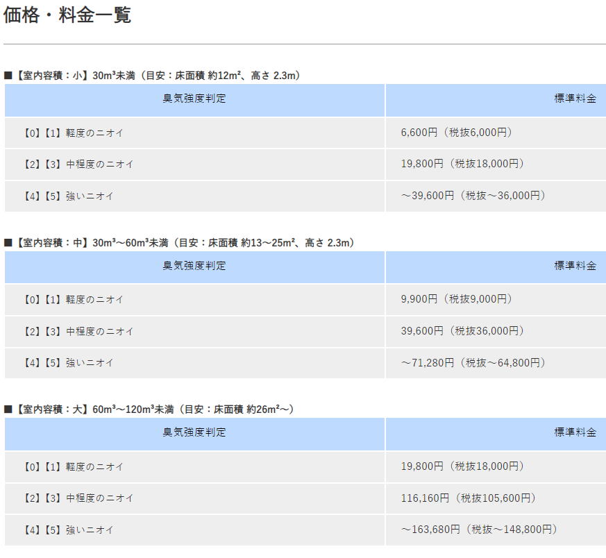 ※ニオイの強さ、エリアの広さ、オゾン脱臭・除菌機の運転時間、ニオイを取り除く清掃作業の実施よって別途料金が必要になる場合があります。