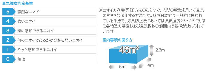 ※臭気拡散エリア、素材への臭気吸収度、室内環境状態により、完全にニオイを取り除くことができない場合があります。