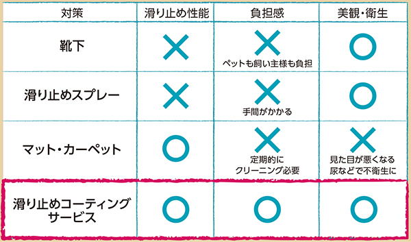 フローリングでの滑りを防ぎ、疾病を持つワンちゃんのスリップ回数の減少、運動量の増加など、ワンちゃんの健康のための滑り止めコーティングサービスです。フロアクリーニング後に滑り止めコーティング剤を施工します。